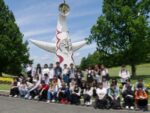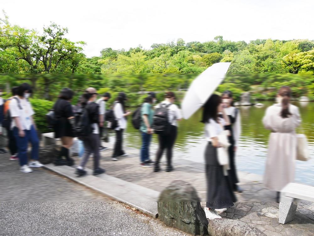 現地では、まず、「平和のバラ園」前において、全員で記念撮影をしました。その後、国立民族博物館(みんぱく)において、世界の諸民族の社会と文化について学びました。皆さん、与えられた課題(ワークシート)に真剣に取り組んでいましたね。 先生もチャレンジしましたが、解答をなかなか探し出せずに苦労しました。皆さんは全問正解できましたか? 「みんぱく」の後は、太陽の塔の前で記念撮影をしました。やはり、太陽の塔は迫力があり、思わず写真を撮りたくなりますよね。その後、2時間程度の自由行動を満喫し、最後に日本庭園を散策しました。心洗われる美しい景色で、空気がおいしく感じましたね。