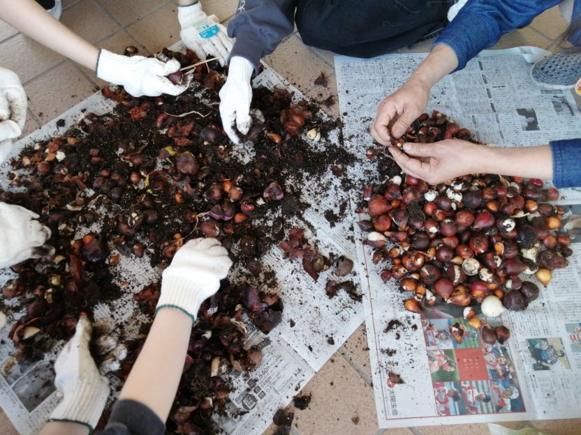 今日は、定時制の生徒たちと共にチューリップの球根を掘り起こす作業をしました。
