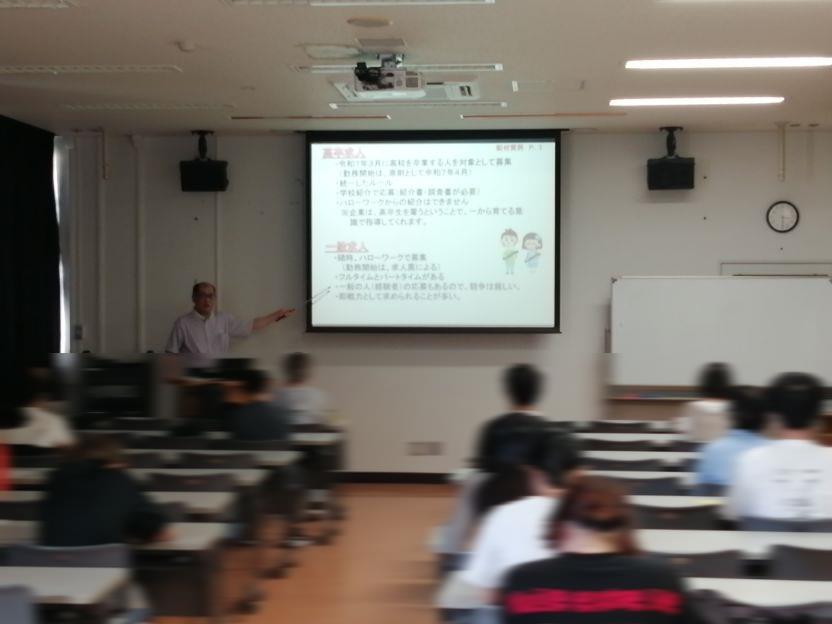 進学を希望する生徒には、一般選抜、学校推薦型選抜、総合型選抜の各入試方法に関して詳細な説明が行われました。また、就職を目指す生徒に対しては、就職指導員橋本先生より企業が求める人材資質や面接対策についての説明があり、担当教員からは高校求人と一般求人の特徴など、就職に関する全般的な説明が行われました。