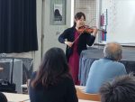 また、2限目の音楽の時間には、プロの演奏家である天野千恵子さんによるバイオリン演奏会が音楽室で行われ、バイオリンの透明な音色を楽しむことができました。さらに、実際にバイオリンを弾かせていただくという大変貴重な経験もさせていただきました。