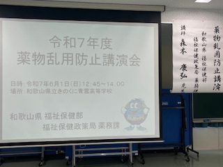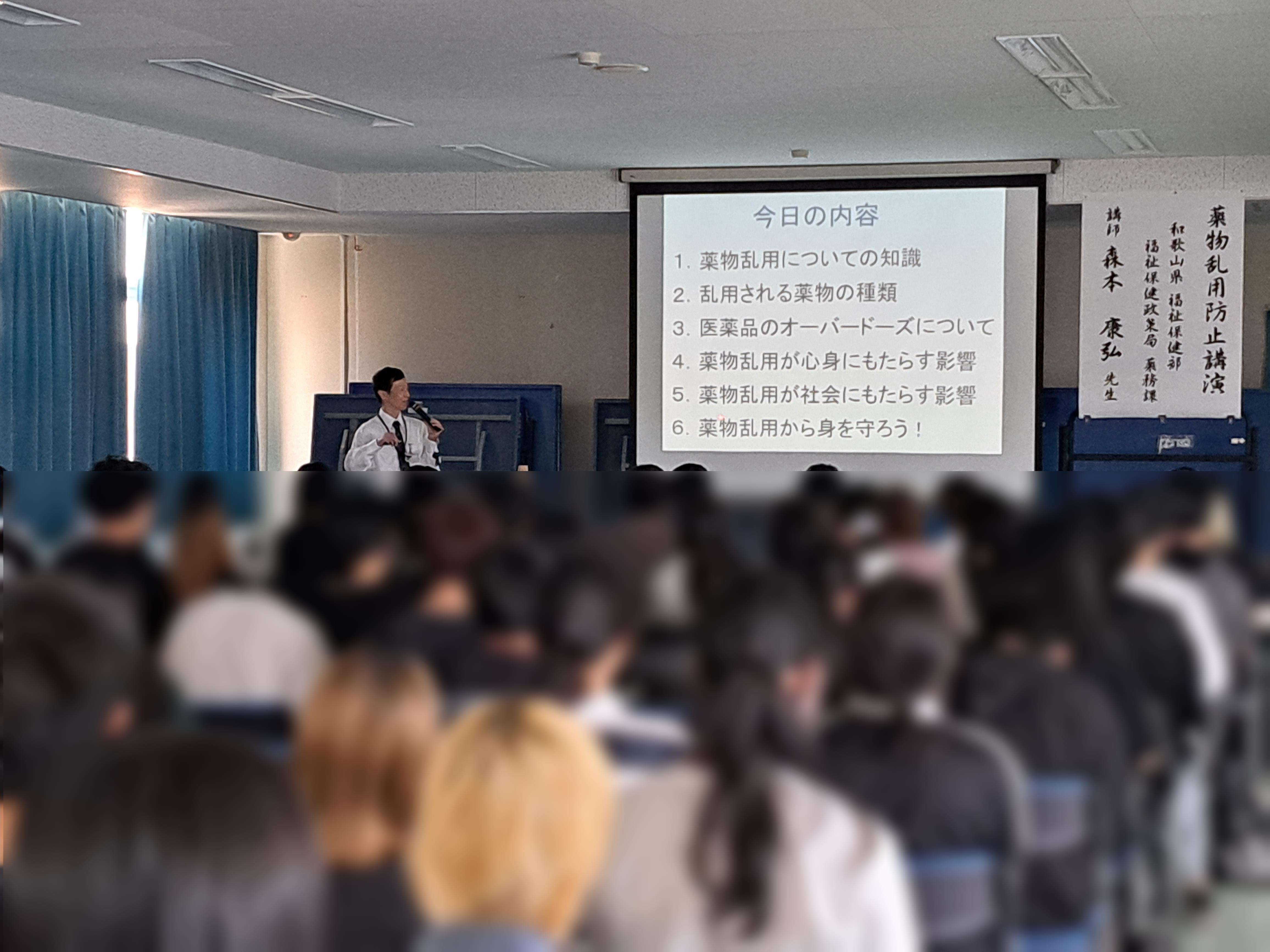 また、午後からは薬物乱用防止講演が行われました。和歌山県福祉保健部薬務課より、講師の先生に来ていただきました。