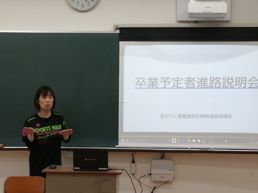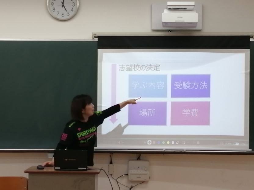 本日は昨日に引き続き、卒業予定者を対象とした進路説明会(進学希望者向け)が行われました。 進学希望者に対して、夏休み中に取り組むべき内容として、学習はもちろん、オープンキャンパスへの参加や希望校の学校案内や願書の入手、面接の練習など、様々な取り組むべき事項とその意義について丁寧な説明がありました。生徒の皆さんには、本日の説明会で学んだ内容をしっかりと実践し、進路実現に向けて意識を高めながら、充実した夏休みを過ごしてほしいと思います。
