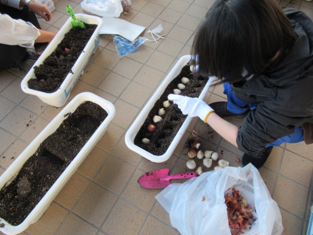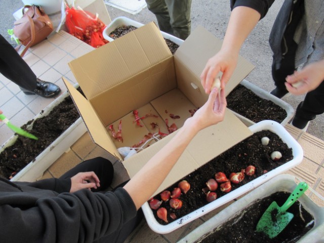 本日、チューリップの球根植えを行いました。1つのプランターに20個の球根を丁寧に植え、生徒たちは来春に咲く色とりどりの花を思い浮かべながら、一生懸命に作業に取り組みました。